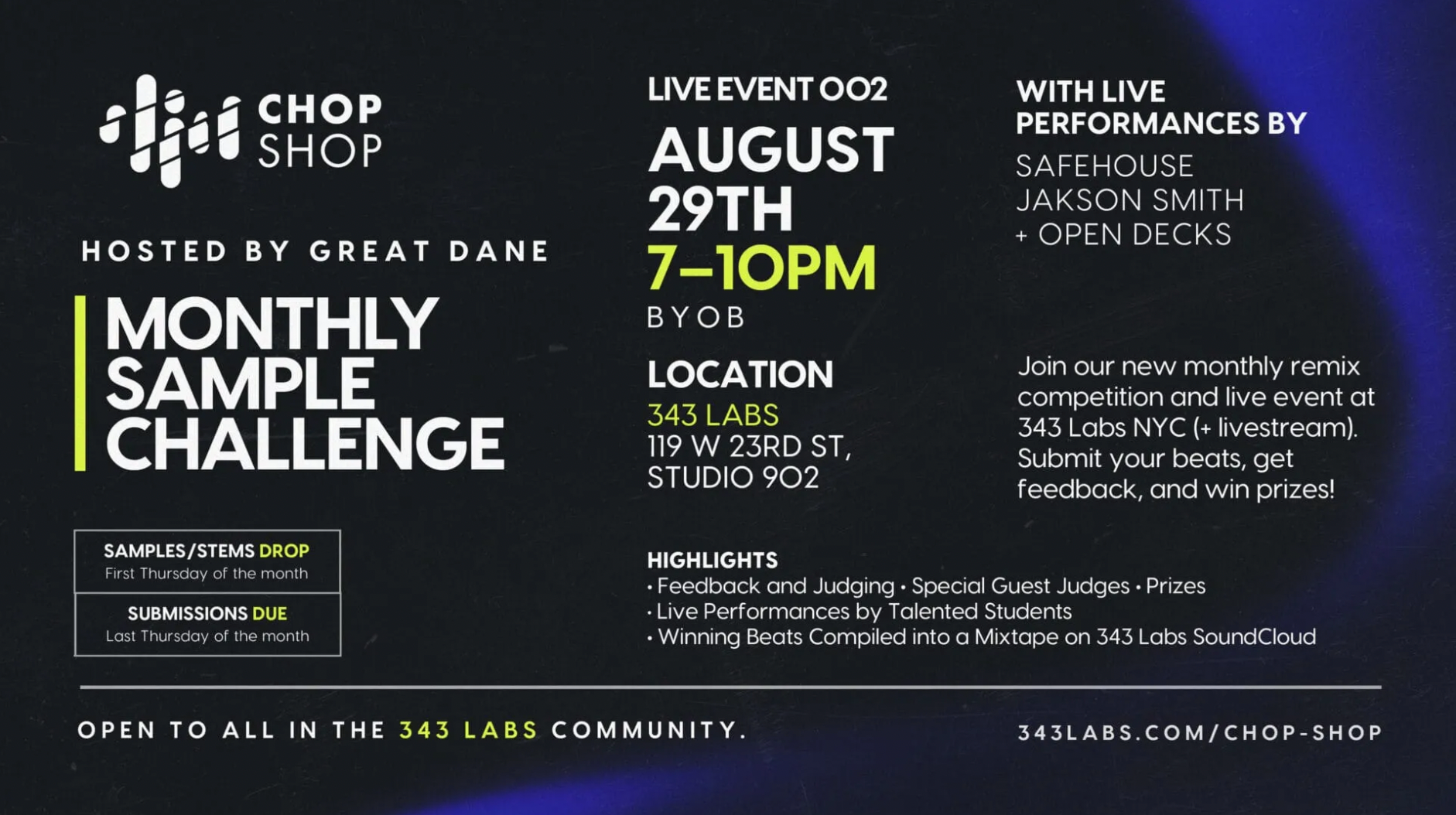 The Chop Shop Monthly Sample Challenge, hosted by Great Dane, is an exciting remix competition and live event held at 343 Labs NYC.
