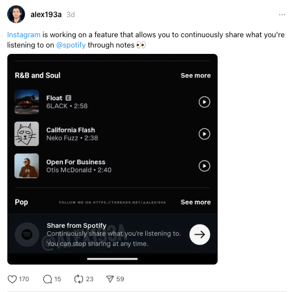 Mobile developer Alessandro Paluzzi spotted the test and posted about it on threads. (See above). There's no guarantee this will be a fully launched addition to the platform. If it does go ahead, it would benefit both Spotify and Instagram.
